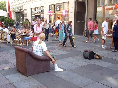 Zum SeitenanfangFußball beherrscht alles. Auch das Straßenkabarett. Diese Zwei wagten es, vor dem Leipziger Augustusplatz die Fußballbegeisterten auf den Arm zu nehmen. Nur Publikum fand sich nicht.