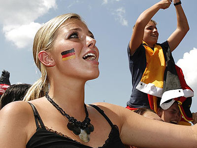 Die besten Plätze vor den großen Fernsehern und Leinwänden besetzen euphorisierte, Schwarz, Rot und Gold geschminkte Mädels, die wahlweise Michael Ballack oder Cristiano Ronaldo anschmachten…