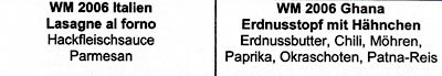 Zum SeitenanfangDie WM verfolgt einen sogar beim Essen. Die SWR-Kantine bietet in dieser Woche täglich je ein typisches Gericht aus dem Land zweier Gruppengegner als Auswahl. Heute:
